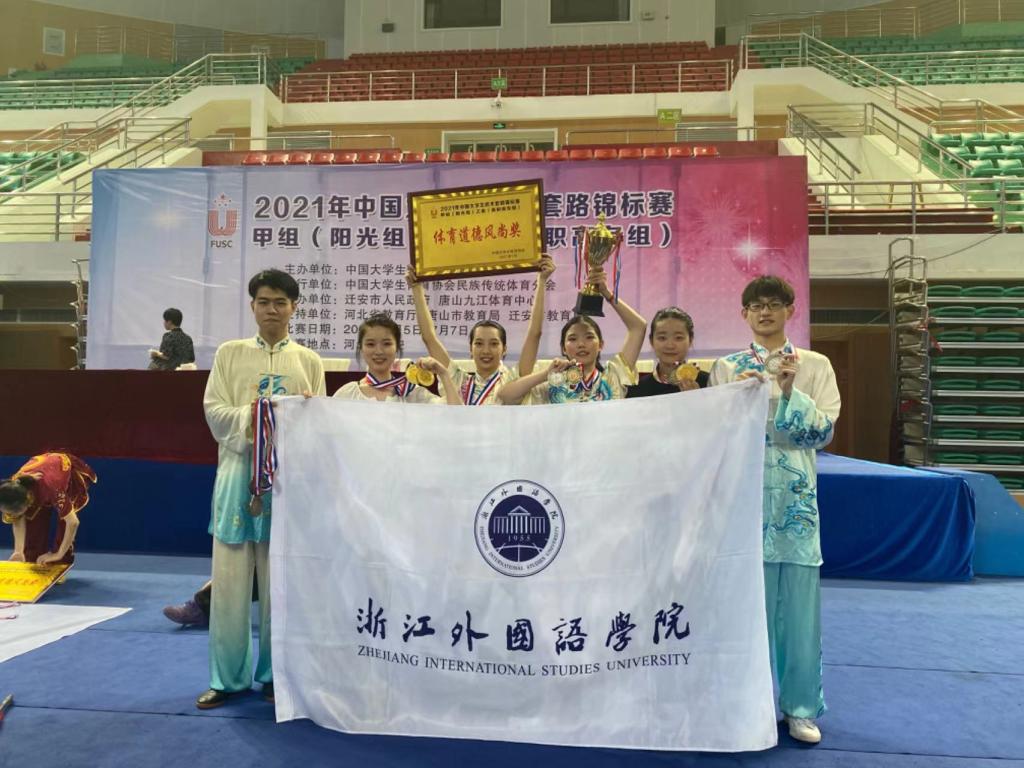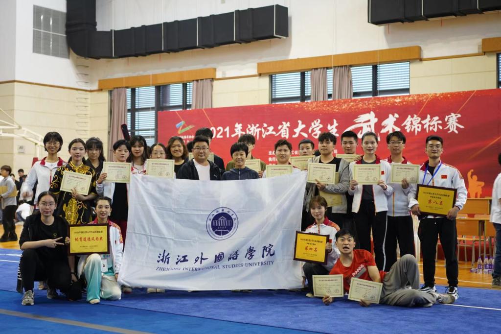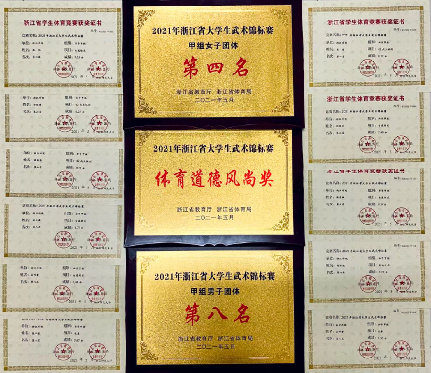 我校武术队秉持基本武术精神,身如桅杆脚如船,伸缩自鞭势如澜。截至2023年12月,校武术队在全国、省市武术比赛中共获178金、43银、40铜等212项成绩,在2019年、2023年浙江省大学生运动会武术比赛中获得男子太极剑、女子自选太极拳冠军,2020年至今获得全国大学生武术比赛女子太极拳、男子传统拳、女子传统拳等多项冠军。并多次获“体育道德风尚奖优秀运动队”称号。