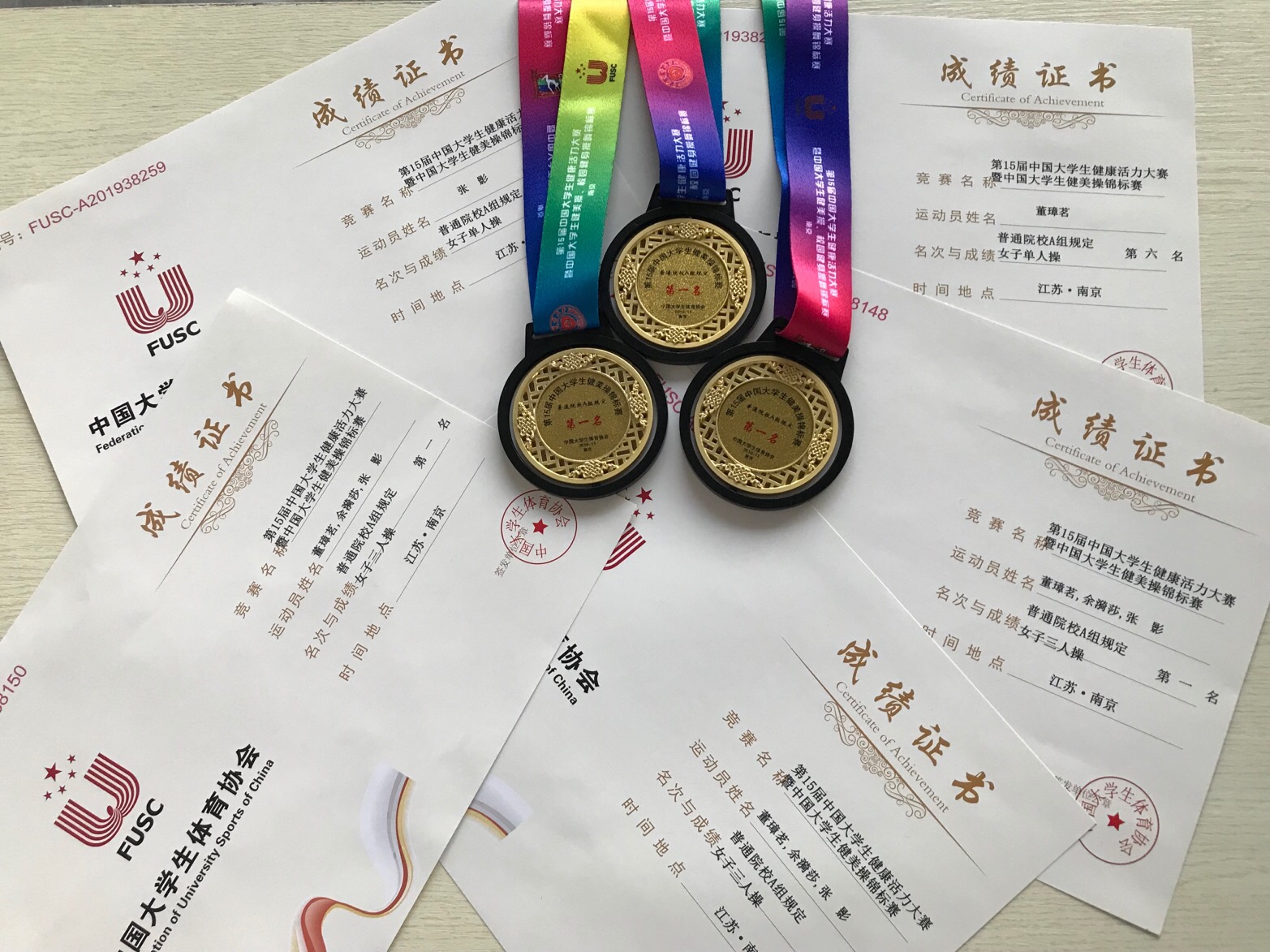 校健美操队成立于2015年,他们栉风沐雨、茁壮成长。在傅金芬、马超两位老师的指导下,始终秉持着天道酬勤的体育精神坚持训练、不断挑战自我。多次代表学校参加省级、国家级大学生操舞比赛等各类竞赛并屡获佳绩,截至今年共获18金13银14铜,和各项前八名累计40余项,并获“体育道德风尚运动队”“优秀教练员”等称号。