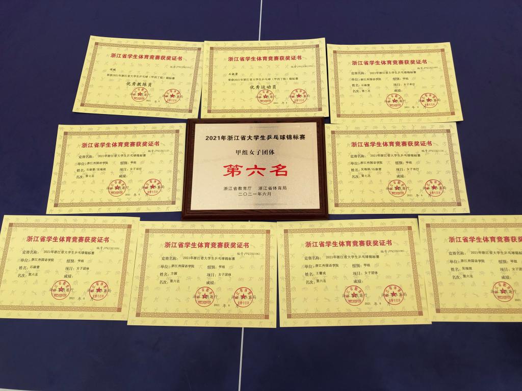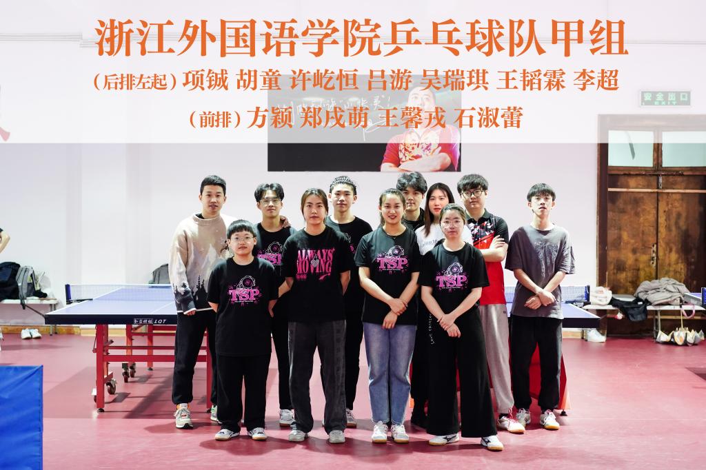 浙江外国语学院乒乓球队成立于2018年,是校优秀运动代表队之一。现有队员二十余人,该队伍旨在促进大学生积极参加体育运动,锻炼体魄,提高身体素质,磨练意志,弘扬“国球精神”,为学生们提供以球会友,共同进步的平台。在浙江省优秀教练员项铖老师的带领下,乒乓球队以自身训练以及技术提高为主,每周进行球队队员训练以及组织队内比赛,加强队伍凝聚力。队内成员团结友好,相互帮助,共同进步。在全队的共同努力下,球队取得2021年浙江省大学生乒乓球锦标赛团体第六名,获甲组女子甲组单打第三名,女子甲组双打第七名;2022年浙江省大学生运动会女子甲组单打第二名;2023年浙江大学生乒乓球锦标赛女子甲组团体第六名,女子甲组单打第五名,浙江外国语学院乒乓球队获得道德风尚奖。