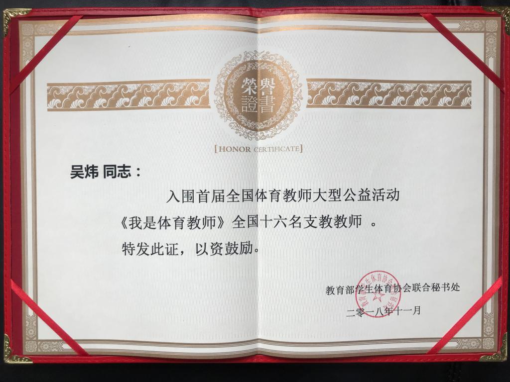 我校体育教师吴炜入围首届全国体育教师大型公益活动《我是体育教师》全国十六名支教教师,受到教育部表彰,也是全国唯一一位获此殊荣的高校教师。近日,教育部学生体育协会联合秘书处为吴炜颁发了荣誉证书。