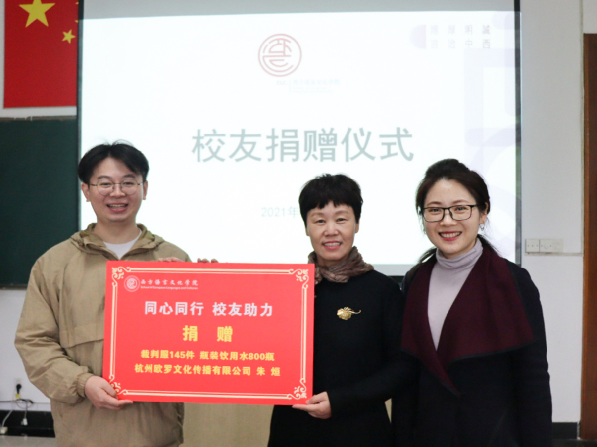 校第十二届运动会暨体育艺术文化节开幕之际,西语学院2019届西班牙语专业校友、杭州欧罗文化传播有限公司创始人朱烜向大赛捐赠比赛物资,体育教研部主任吴炜,西语学院党总支书记毕莹、副书记方盼等相关负责人出席捐赠仪式。