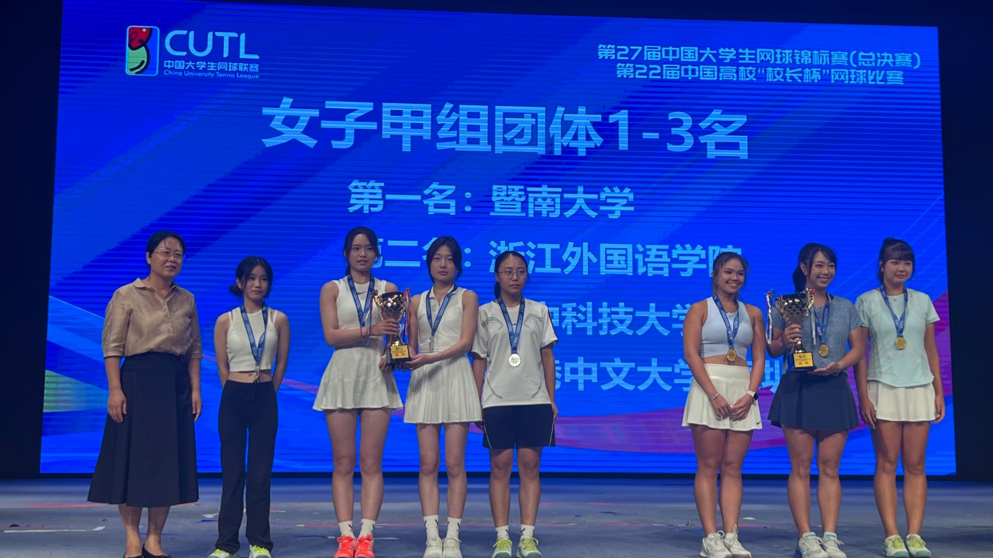 校网球队取得历史性突破的成绩,彰显了卓越的技术实力与优秀的意志品质,更充分展现了浙外学子坚韧不拔、敢打敢拼的精神风貌,同时也是学校体育教学和运动队训练相结合的科学性的教学成果。学校将继续开拓创新,积极培养更多优秀的体育人才。