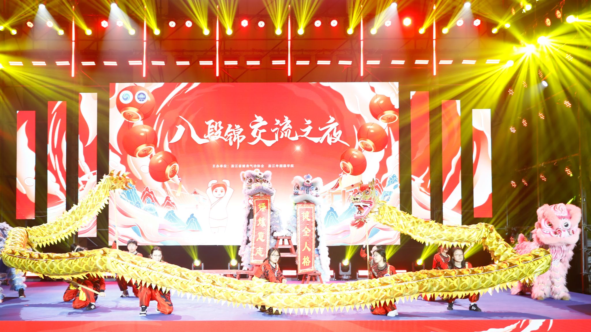 活动伊始,我校龙狮队闪亮登场,世界龙狮锦标赛冠军曹帅老师及其团队带来表演《龙腾紫苏,狮舞东方》。锣声锵锵,鼓声阵阵,“潜龙” 顺势跃起,展现磅礴气势,“醒狮” 睁目昂首,威风尽显。在这热烈的氛围中,正式拉开“八段锦交流之夜” 活动的序幕。