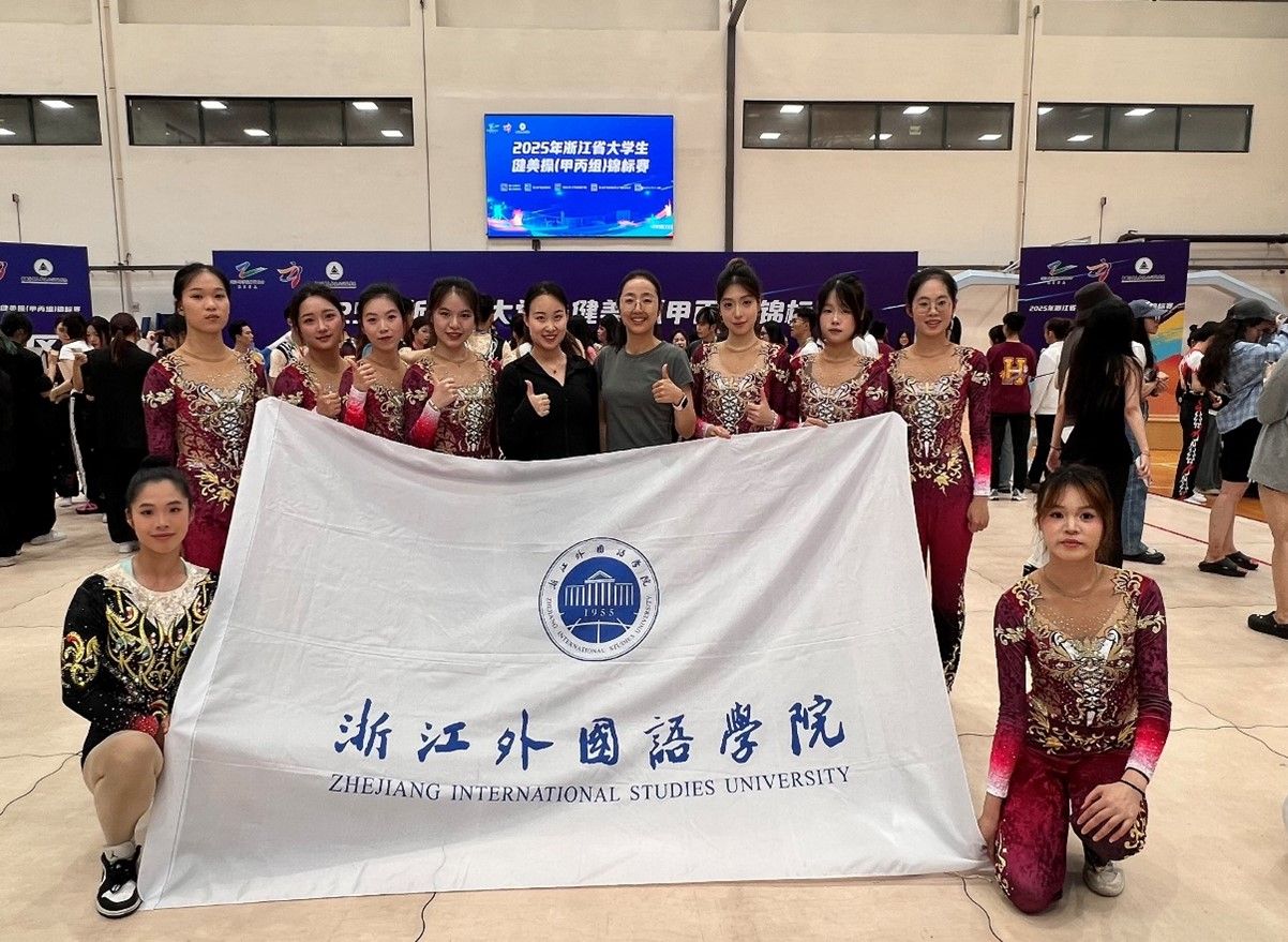 近日,由浙江省教育厅、浙江省体育局主办的2025年浙江省大学生健美操(甲丙组)锦标赛在中国计量大学现代科技学院落幕。在傅金芬和马超两位老师的指导下,应伽羽同学获女子单人操项目第六名,朱同欣等同学获5-8人有氧踏板项目第九名。