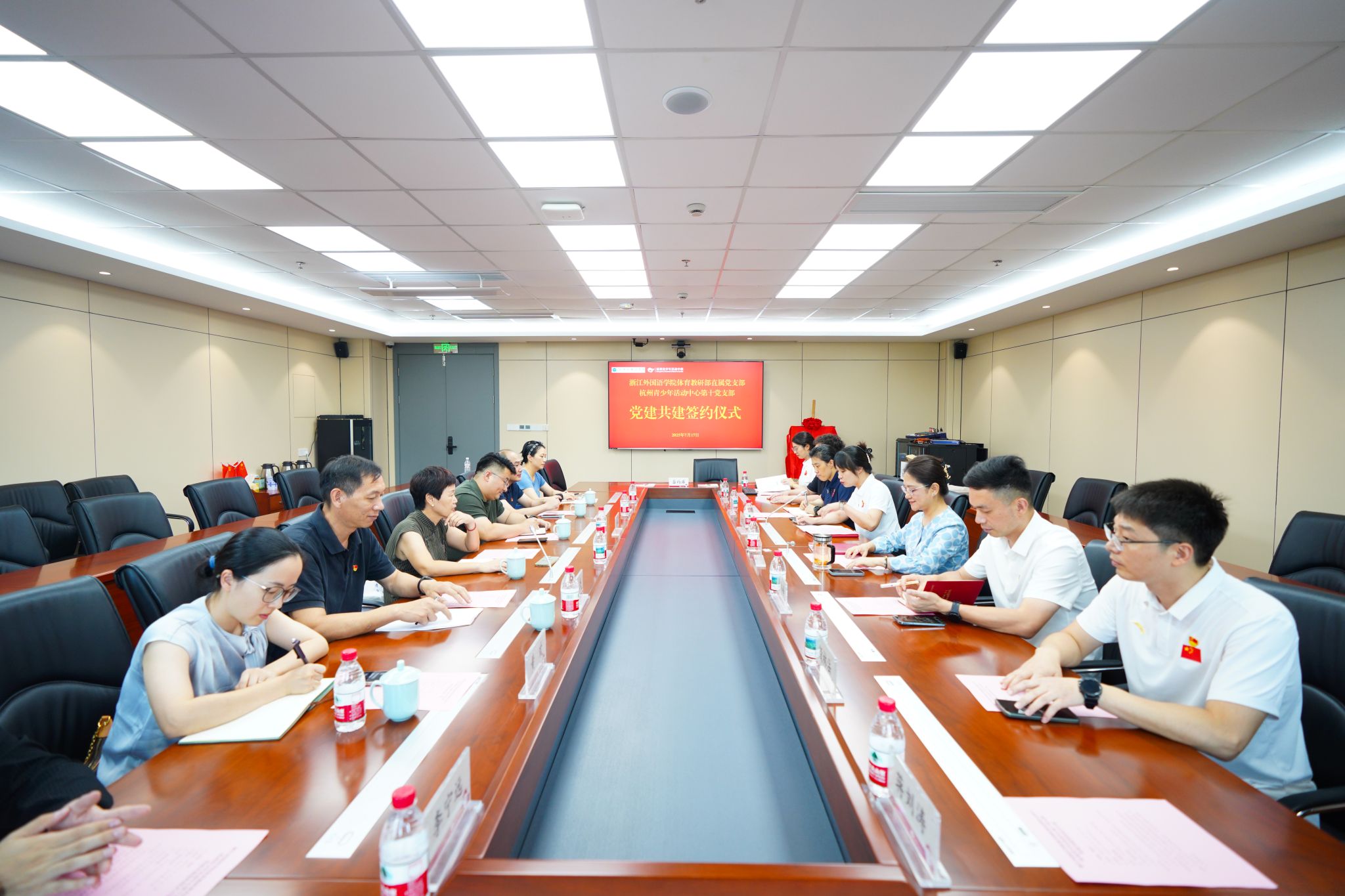 7月17日下午,浙江外国语学院体育教研部直属党支部与杭州青少年活动中心第十党支部在杭州青少年活动中心综合楼410室举行党建共建签约仪式,共同开启“宫校合作”新篇章。仪式由杭州青少年活动中心体育部副部长张慧飞主持。